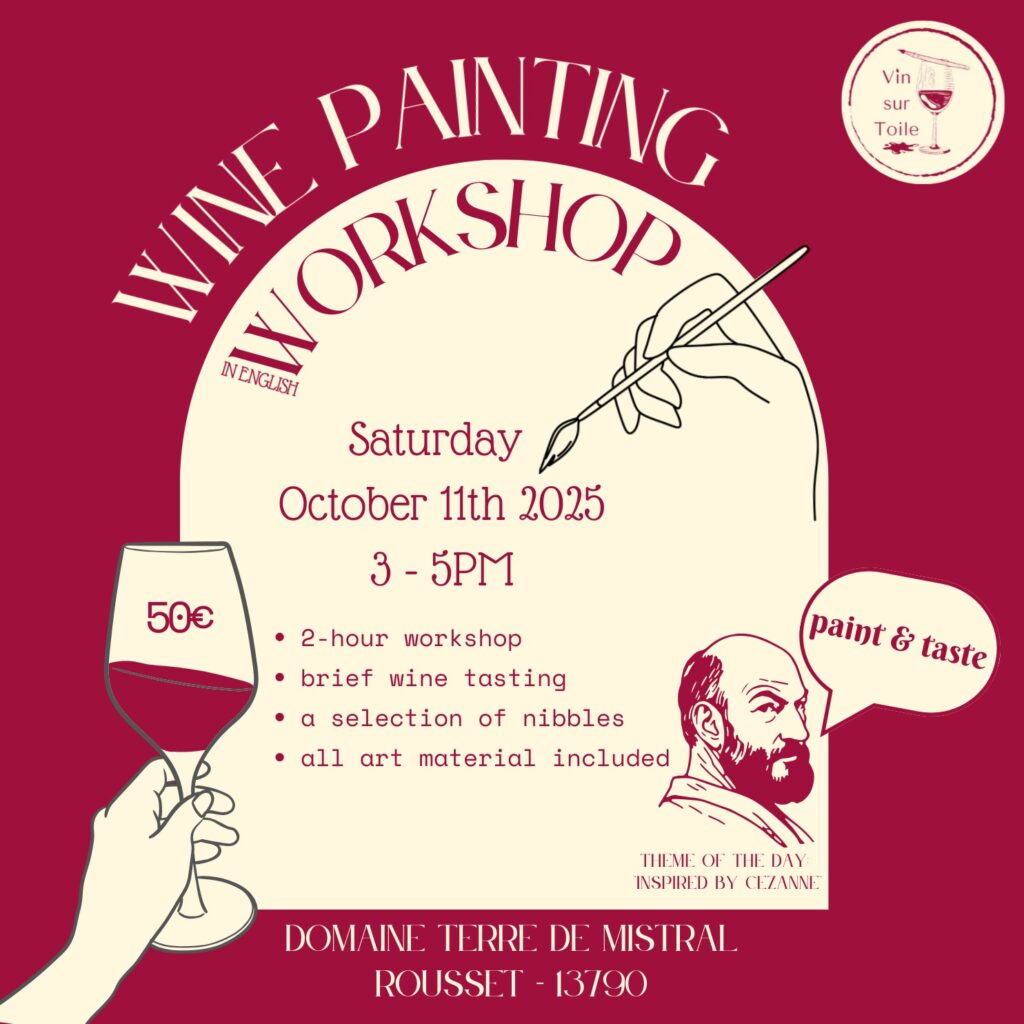 Atelier initiation de peinture au pigment de vin avec l’artiste Cris Motta.Pour clôturer l’exposition estivale du domaine Terre de Mistral, venez découvrir le vin autrement…sur papier aquarelle. Un verre à déguster dans une main et un pinceau dans l’autre, plongez à la découverte de cet art original et poétique.