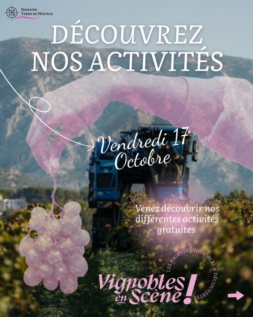 A l’occasion de Vignobles en Scène, le nouveau parcours sensoriel du Domaine Terre de Mistral vous ouvre ses portes gratuitement de 14h à 18h ! A l’aide d’un questionnaire numérique, parcourez les différentes étapes et éveillez vos sens de la vue, de l’odorat, du goût ou encore du toucher autour de l’univers du vin. Une manière originale et ludique de découvrir l’oenologie, tout en se challengeant seul ou à plusieurs.