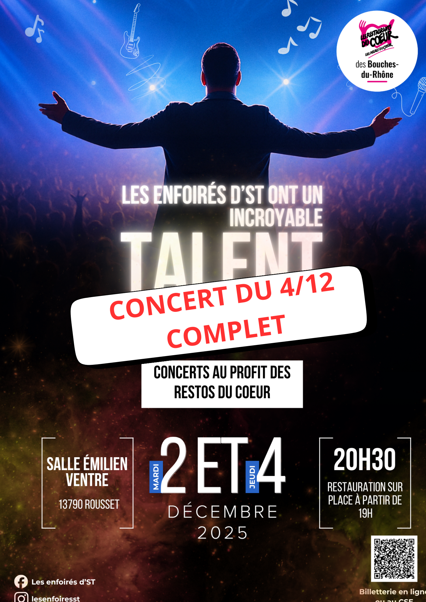 Prenez vos places en avances via le QR code de l’affiche ou sur https://www.helloasso.com/associations/les-restos-du-coeur-des-bouches-du-rhone/evenements/les-enfoires-de-stmicroelectronics-2025 .