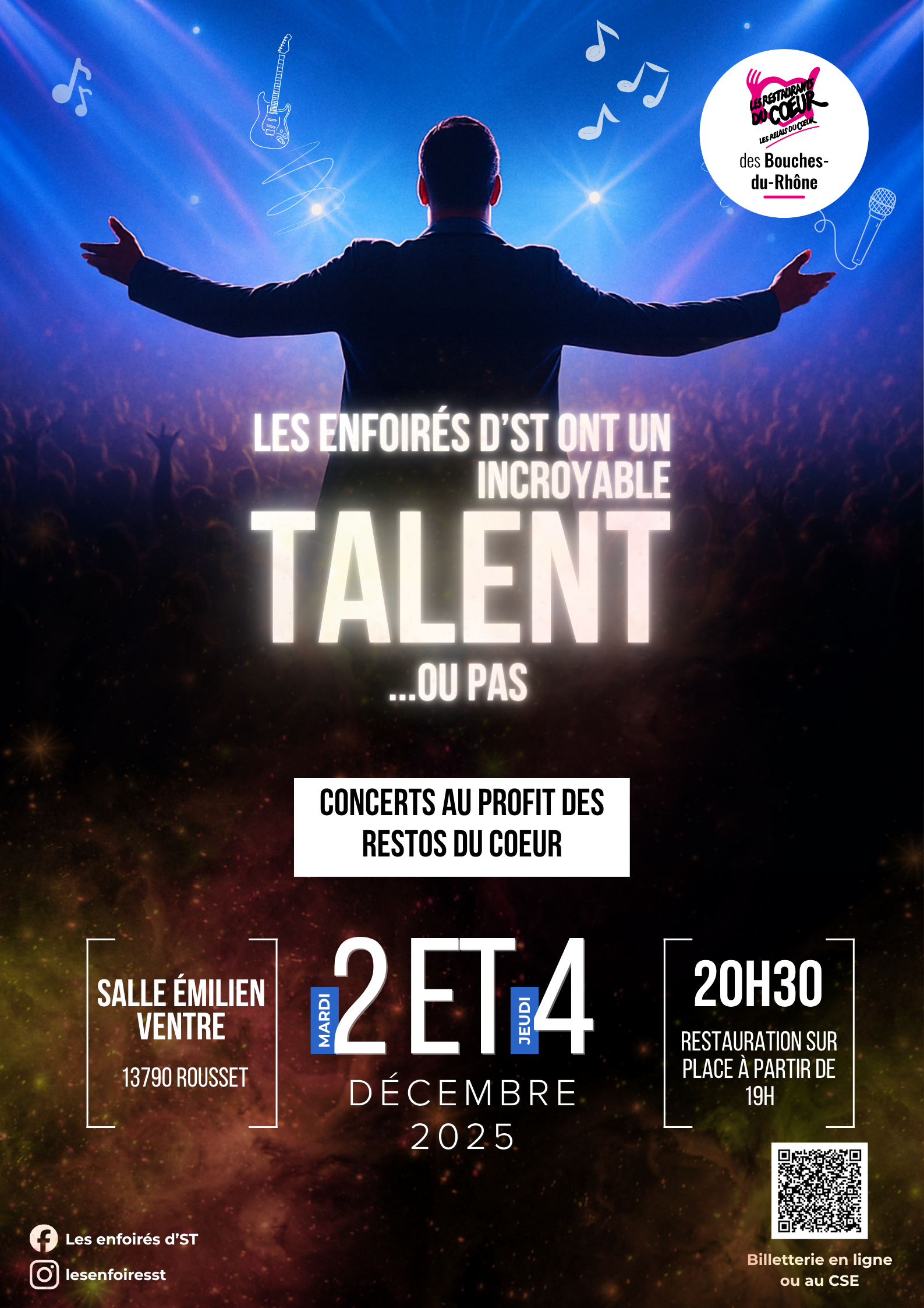 Prenez vos places en avances via le QR code de l’affiche ou sur https://www.helloasso.com/associations/les-restos-du-coeur-des-bouches-du-rhone/evenements/les-enfoires-de-stmicroelectronics-2025 .